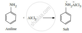 \[\ce{C6H5NH2 + AlCl3 -> \underset{(Salt)}{C6H5NH^+_2AlCl^-_3}}\]
