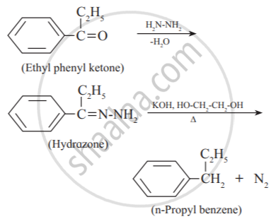 - \[\ce{\underset{(Propanal)}{C2H5 - CHO} ->[H2N-NH2][-H2O] C2H5 \underset{(Hydrazone)}{- CH = N - NH2} ->[KOH,HO-CH2-CH2-OH][\Delta] \underset{(Propane)}{CH3 - CH2 - CH3 - N2}}\]