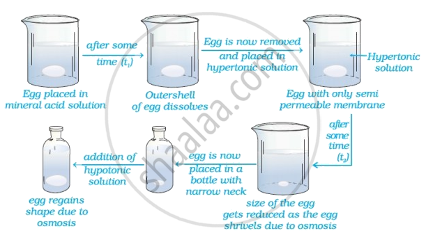 Egg is placed in mineral acid solution - after time egg is removed and placed in a hypertonic solution* - Size of the egg gradually decreases after some time and it shrivles due to osmasis. SInce the egg has shrivelled it can, now be inserted easily into a bottle with narrow mouth. The egg is, therefore, placed in a battle with narrow neck and then a hypotonic solution is filled into this bottle. On adding hypotonic solution**, egg regains shape due to osmosis.