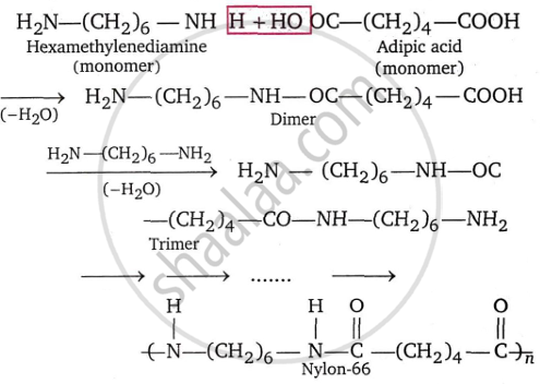 Nylon-66 is a polymer that grows in steps. The following sequence of condensation processes results in the step-growth polymerization of the bifunctional monomers adipic acid and hexamethylenediamine.