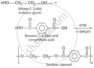 The monomers are ethylene glycol and terephthalic acid or dimethýlterephthalate. When these monomers are mixed and heated at 500 K in the presence of zinc acetate and antimony trioxide catalyst, terylene (or dacron) is formed.