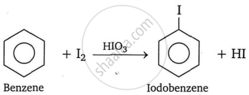 Iodobenzene is prepared by reacting benzene with iodine (I2) in the presence of iodic acid (HIO3). The oxidizing agent (HIO3) helps form the iodine electrophile and removes HI formed in the reaction. This is an electrophilic substitution reaction.