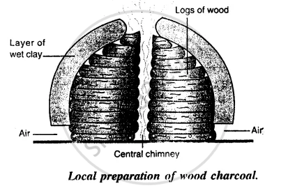 (c) Wood charcoal is prepared when wood is heated in a limited supply of air. Locally wood charcoal is prepared by piling logs of wood one above the other with a gap in the centre of the pile. The pile is covered with wet clay to prevent the entry of air. A few holes are left at the bottom of the pile. The wood is set on fire. After some time when fire dies out, wood charcoal is left behind. The other substances are -wood tar, pyroligneous acid and wood gas.