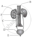 Identify the labels (A-F) in the given diagram of excretory system in human beings.