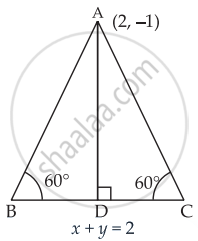 The vertex of an equilateral triangle is (2, 3) and the equation of the opposite side is x + y = 2. Then the other two sides are y – 3 = `(2 +- sqrt(3)) (x - 2)`.