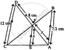 In the adjoining figure, AB || EF || CD, CD = 12 cm, AB = 7.2 cm and DF = 4.8 cm. Prove that `(CF)/(FB) = (DF)/(FA)`. Also, find the value of y, if x = 4.5 cm.