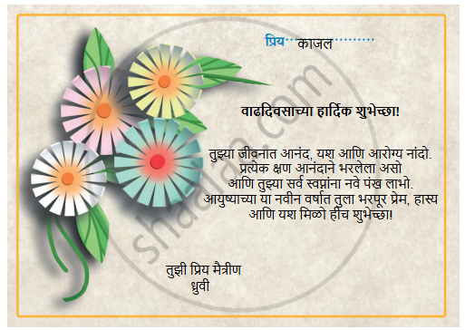 खाली दिलेल्या भेटकार्डावर तुमच्या आवडत्या मित्र मैत्रिणीच्या वाढदिवसानिमित्त शुभेच्छा संदेश तयार करा. - Marathi [मराठी]