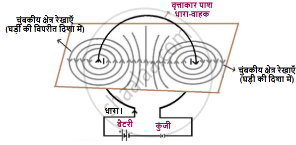 किसी धारावाही वृत्ताकार पाश द्वारा उत्पन्न चुम्बकीय क्षेत्र की चुम्बकीय क्षेत्र रेखाओं का पैटर्न खींचिए। इस पैटर्न पर (i) धारा तथा (ii) चुम्बकीय क्षेत्र रेखाओं की दिशा अंकित कीजिए।