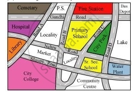 (a) Colour the map as follows: Blue − water plant, red − fire station, orange − library, yellow − schools, green − park, pink − college, purple − hospital, brown − cemetery.