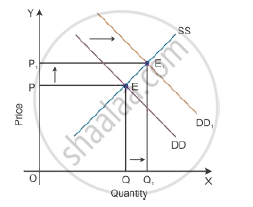 Because of an increase in the demand, there will be an increase in competition among buyers. So, they would be willing to pay more prices to obtain more units of a good in the market. Hence, there will be an increase in the market price to OP2. Now, the new market equilibrium will be at Point E1, where the new demand curve DD1 intersects the supply curve SS.