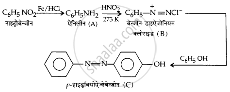 \[\ce{C6H5NO2 ->[Fe/HCl] A ->[HNO2][273 K] B ->[C6H5OH] C}\]