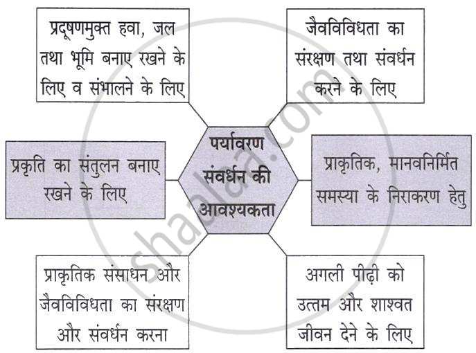 निम्नलिखित प्रवाह तालिका पूर्ण कीजिए: पर्यावरण संवर्धन की आवश्यकता प्रकृति का संतुलन बनाए रखने के लिए प्राकृतिक एवं मानवनिर्मित समस्या के निराकरण हेतु - Science and Technology 2 [विज्ञान और प्रौद्योगिकी २]