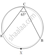 ‘O’ केंद्र वाले वृत्त में अंतर्लिखित ∠ACB का माप 65° है, तो उसके द्वारा अंतःखंडित चाप AXB का माप कितना?