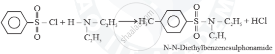 The hydrogen attached to nitrogen in sulphonamide is strongly acidic due to the presence of electron with drawing sulphonyl group and the reaction with 2° amine, N, N-diethyl benzene sulphonamide is formed.