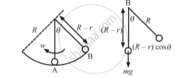 \[mg\left( R - r \right) \left( 1 - \cos \theta \right) + \frac{1}{2}m v_c^2 + \frac{1}{2}I \omega_1^2 = constant\] \[\text { Substituting the values of v_c and } \omega_1 \text { in the above equation, we get: }\] \[mg \left( R - r \right) \left( 1 - \cos \theta \right) + \frac{1}{2}m \left( R - r \right)^2 \omega^2 + \frac{1}{2}m r^2 \left( \frac{R - r}{r} \right) \omega^2 = \text { constant } \left( \because I = m r^2 \right)\] \[mg\left( R - r \right) \left( 1 - \cos \theta \right) + \frac{1}{2}m \left( R - r \right)^2 \omega^2 + \frac{1}{5}m r^2 \left( \frac{R - r}{r} \right) \omega^2 = \text { constant }\]\[ \Rightarrow g\left( R - r \right) \left( 1 - \cos \theta \right) + \left( R - r \right)^2 \omega^2 \left[ \frac{1}{2} + \frac{1}{5} \right] = \text { constant }\]