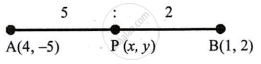 Point P divides the line segment joining the points A(4, –5) and B(1, 2) in the ratio 5:2. Co-ordinates of point P are `bbunderline(13/7, 0)`.