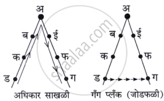 वरील पहिल्या आकृतीनुसार ‘ड’ आणि ‘ग’ यांच्याबरोबर ‘क’, ‘ब’, ‘अ’, ‘ई’ आणि ‘फ’ यांच्या संवादाला ‘अधिकार साखळी’ म्हणतात आणि दुसऱ्या आकृतीनुसार ‘ड’ व ‘ग’ यांच्यामधील संदेशवहनाला (संवादाला) ‘गँग प्लँक (जोडफळी)’ म्हणतात; कारण ‘ड’ व ‘ग’ यांच्यामध्ये कोणाचीही मदत न घेता थेट संवाद होत आहे.