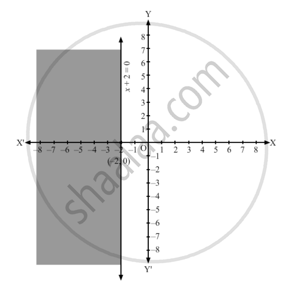 Converting the inequation to equation, we obtain x + 2 = 0, i.e x = \[-\] Clearly, it is a parallel line to y-axis at a distance of \[-\]2 units from it. This line divides the xy plane into two parts, viz LHS of x =\[-\] 2 and RHS of x = \[-\] 2. To determine the region represented by the given inequality, consider point O(0,0). Clearly, (0,0) does not satisfy the inequality. So, the region that does not contain the origin is represented by the given inequality.
