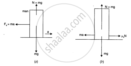 Figure shows a man standing stationary with respect to a horizontal conveyor belt that is accelerating with 1 m s–2. What is the net force on the man? If the coefficient of static friction between the man’s shoes and the belt is 0.2, up to what acceleration of the belt can the man continue to be stationary relative to the belt? (Mass of the man = 65 kg.)