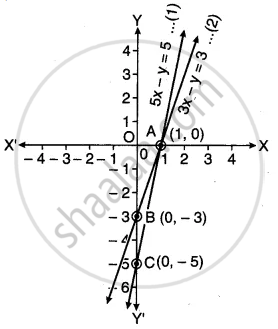 समीकरणों 5x - y = 5 और 3x - y = 3 के ग्राफ खींचिए। इन रेखाओं और y-अक्ष से बने त्रिभुज के शीर्षों के निर्देशांक ज्ञात कीजिए। इस प्रकार बने त्रिभुज के क्षेत्रफल का परिकलन कीजिए।
