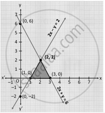 Solve the following system of equations graphically: 2x + y = 6, 2x – y – 2 = 0. Find the area of the triangle so formed by two lines and x-axis. - Mathematics