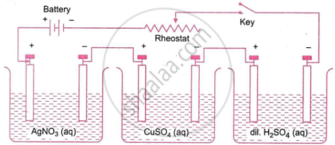 Suppose three voltameters connected in series contain aqueous solutions of silver nitrate, copper sulphate, and dilute sulphuric acid, respectively, as shown in Fig. On passing electric current, electrolysis takes place in all three cells, and the substances produced at the cathodes of these cells are Ag(s), Cu(s), and H2(g), respectively. If the same current is passed for the same time, it is found that