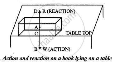 (1) Consider a book lying on the table. Its weight (w) acts vertically downward (Action on the table) and the book does not fall. That means the table is exerting equal force on the book, but in the opposite direction [normal reaction R] called reaction. Thus, action and reaction are equal and opposite.
