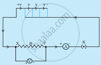 - Create a circuit as shown in the diagram, consisting of a nichrome wire XY of length, say 0.4 m, an ammeter, a voltmeter and three cells of 1 V each. Place all the equipment properly.