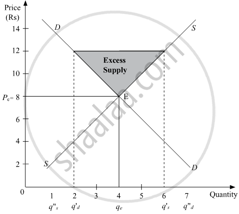 For example, let us suppose that the price of a good is Rs 12 (which is higher than the equilibrium price of Rs 8), and at this price, only 2 units of output are demanded, while as per the market supply curve SS, the producers are ready to sell 6 units of output. As the market supply is more than the market demand, so there is a situation of excess supply by 4 units (i.e. 6 –2 = 4 units). This excess supply will increase competition among the sellers; consequently, they will reduce the price in order to sell more of their output. The fall in price will continue until the price becomes Rs 8, where market demand equals market supply.