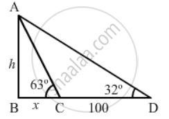 Let h be the height of the tower and the angle of elevation as observed from the foot of the tower is 32° and observed move towards the tower with distance 100 m then the angle of elevation becomes 63°.