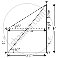 tan 45° = `"TB"/"AB" = ("H" - 10)/x`