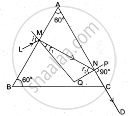 The Figure below shows a ray of monochromatic light LM incident on the first surface AB of a regular (equilateral) glass prism ABC. The emergent ray grazes the adjacent surface AC. Calculate the angle of incidence. (Refractive Index of glass = 1.5)