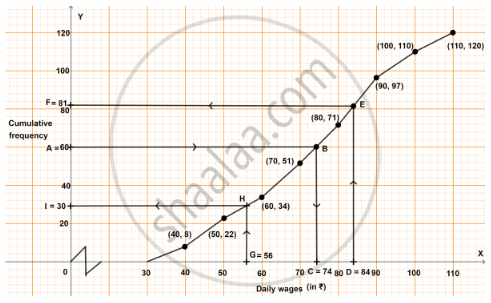 10. Through point H, draw a horizontal line which meets y-axis at point I. The value of point I on y-axis represents no. of employees earning less than or equal to ₹ 56 per day.