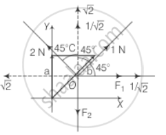 On resolving forces into rectangular components, in equilibrium forces `(F_1 + 1/sqrt(2))` N are equal to `sqrt(2)` N and F2 is equal to `(sqrt(2) + 1/sqrt(2))` N.