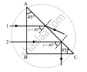 Both the rays will fall on the side AC with angle of incidence (i) equal to 45°. Critical angle of ray 1 is greater than that of i. Hence, it will emerge from the prism, as shown in the figure. Critical angle of ray 2 is less than that of i. Hence, it will be internally reflected, as shown in the figure.