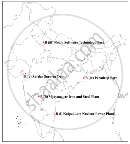 (B) Locate and label any three of the following with appropriate symbols on the same given outline political map of India.