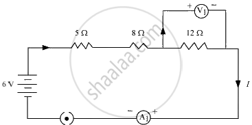 विद्युत परिपथ का व्यवस्था आरेख खींचिए जिसमें 2 V के तीन सेलों की बैटरी, एक 5 Ω प्रतिरोधक, एक 8 Ω प्रतिरोधक, एक 12 Ω प्रतिरोधक तथा इसमें प्रतिरोधकों से प्रवाहित विद्युत धारा को मापने के लिए ऐमीटर तथा 12 Ω के प्रतिरोधक के सिरों के बीच विभावांतर मापने के लिए वोल्टमीटर लगाइए। ऐमीटर तथा वोल्टमीटर के क्या पाठ्यांक होंगे?