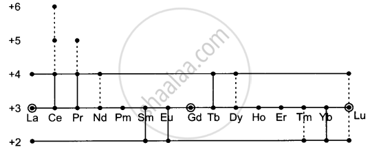 Different oxidation states are displayed by lanthanum and lanthanoids. Dotted lines show ambiguous or short-lasting valencies.