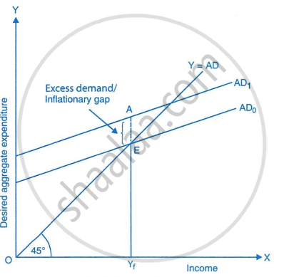 Aggregate demand is the AD curve, and aggregate supply is the AS curve (as shown in the diagram below). While the aggregate demand curve and the aggregate supply curve intersect each other, the full employment equilibrium is attained at Point E. OY is the full employment level of output, and EY is the aggregate demand at full employment level of output. If the aggregate demand increases beyond the full employment level of output from EY to FY, then the economy will have excess demand, i.e., a situation of an inflationary gap (FY − EY = FE).