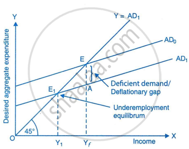 In Fig., the aggregate expenditure curve AD0 intersects the 45° line at E, which gives us the equilibrium income OYf. This is the full employment level of income. Now, suppose government expenditure falls, as a result of which the new aggregate expenditure curve shifts to AD1. At the full employment level of income, the aggregate supply is OYf or EYf. This is greater than the actual aggregate demand of AYf. The deficient demand at the full employment income level is EA.