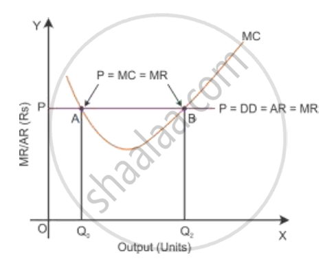In the given diagram, the MC curve intersects the price line (or MR) at two points—A and B.