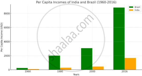 With the help of given statistical data about the per capita incomes of India and Brazil. Prepare a simple bar graph and answer the following questions.