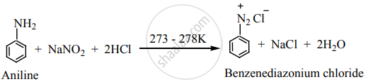 \[\ce{C6H5NH2 + NaNO2 + 2HCl ->[273 - 278 K] C6H5\overset{+}{N2}\overset{-}{C}l + NaCl + 2H2O}\]