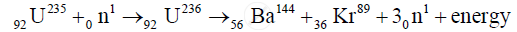 `""_0^1n + ""_92^235U -> ""_56^144Ba + ""_36^89Kr + 3 ""_0^1n`