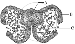 A – Connective, B – Endothecium, C – Pollen grain.