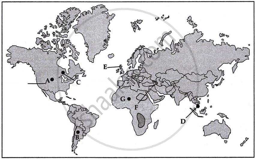 On the given political outline Map of the World, seven geographical features have been marked as A, B, C, D, E, F and G. Identify any FIVE correctly with the help of the following information and write their correct names on the lines marked near them: