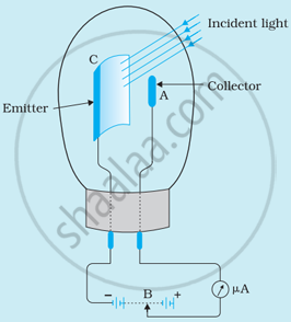 Photoelectric effect is the phenomenon of the ejection of electrons when the radiation of suitable frequency is made to fall on the surface of a metal. When light of a suitable wavelength falls on the emitter C given in the diagram, the photoelectrons are emitted. These photoelectrons are drawn to the collector A. The photoelectric current of the order of a few microamperes can be normally obtained from the device given in the figure. The device given converts a change in intensity of illumination into a change in photocurrent. This current can be used to operate control systems and in light measuring devices. The devices are made up of metals with low ionization enthalpies, for example, platinum, whose work function is 6.35 eV.