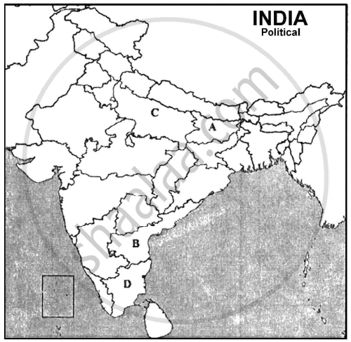 In the given political outline map of India, four states have been marked as (A), (B), (C) and (D). Identify the States on the basis of the information given below and write their correct names in the answer-book along with the respective serial numbers of the information used and the concerned alphabet as per the format that follows: