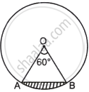 A chord of a circle of radius 10 cm subtends an angle of 60° at the centre O. Find the area of the shaded region. `("Use"  sqrt(3) = 1.73, sqrt(2) = 1.41 and π = 3.14)`