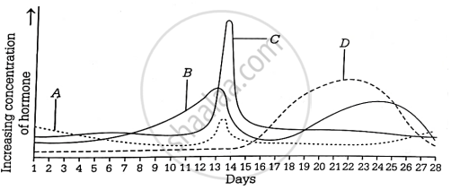 The following graph represents the relative concentrations of the four hormones present in the blood plasma of a woman during her menstrual cycle. Identify the hormones A, B, C and D.